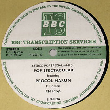 BBC Sight and Sound (TV and Radio simulcast) 1977 ( - Cartwright, + Solley) Something Magic Illustration: BBC transcription disc CN2785/S Stereo. PROCOL HARUM In Concert - Stereo Pop Special 146; 57m 35sec: very collectable! |