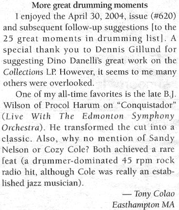 Here's most of that beautiful tribute to BJ from Stephen Braitman (Letters, Goldmine Magazine, 5/31/91). What preceded the letter was PH's announcement of their reunion - reported in Goldmine with the comment "What, no BJ Wilson?" Sadly, PH didn't announce BJ's death when they announced their reunion, and Goldmine had to be informed by fans after their initial piece ran.. Jeff Tamarkin's response was basically an apology, along with additional words of praise for BJ's greatness as a musician.