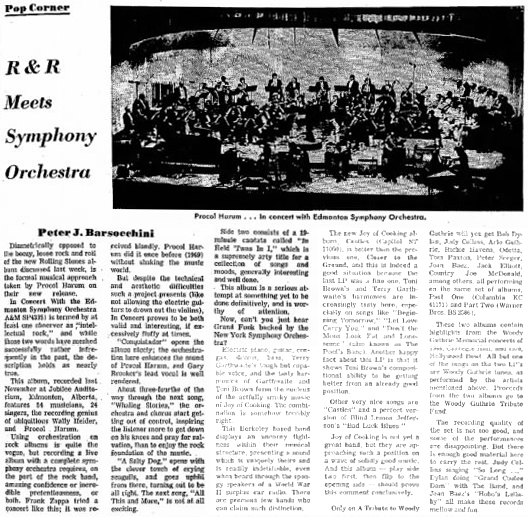 In Concert With the Edmonton Symphony Orchestra (A&M SP4335) is termed by at least one observer as ‘intellectual rock’, and while those two words have meshed successfully rather infrequently in the past, the description holds as nearly true.