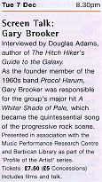 GARY BROOKER talks to Douglas Adams, Tue 7 Dec 8.30 pm Cinema 1