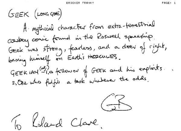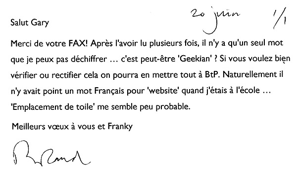 Gary Brooker's FAX to BtP from France about his MBE contains an appealing neologism, 'Geekian'. We were not at first able to decipher this word, which led to the exchange of the following FAXes on 20 June 2003: