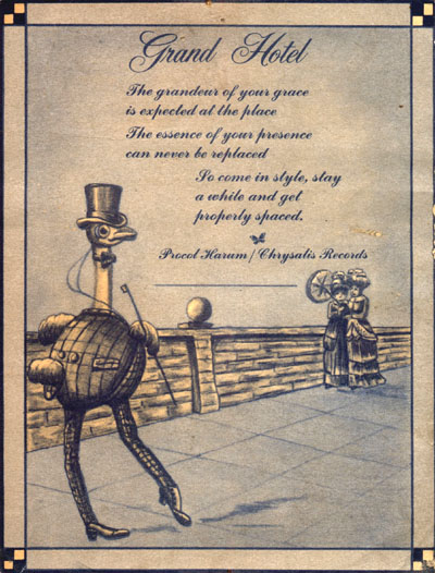 This whimsical invitation to the Grand Hotel promotional party (where BJ met Andy Warhol ... see here) was kindly sent to BtP by Barry Sinclair ... see his website here. A monocled ostrich, sporting the garb of an Edwardian toff, steps out towards two crinolined ladies equipped with a plainly-inadequate parasol. The text, with its oddly-spaced line-breaks, reads ... Grand Hotel The grandeur of your grace The essence of your presence So come in style, stay Procol Harum / Chrysalis Records |