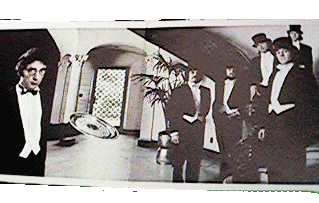 A convention of witches and allied demons cut loose, perhaps at a Solstice. The summer Solstice is a particular favourite. Certainly 'greeting the dawn' features highly on the agenda. 'Crystal clear' implies invocation of spirits. The candles are probably black. Feasting and cavorting throughout the night. Someone (?the devil) asks for his 'continental bride' - witches were known as brides of Satan (see below). Pinching and biting are a favourite pastime of imps. And lots of dancing! The waiters dance on fingertips just as fairies dance on a pinhead. The wine has been dancing too. The witches like their meat rare and dance with it 'gambolling steak' although of course stake could have a very different connotation here. 'One more toast' an illusion to witch-burning after which witches usually are toast. 'Peach flambé' is a sideways reference to burning. The peach is known as the 'devil's nectarine' because its skin is hairy like an old crone's. The McVitie's ginger nut is also referred to as the 'devil's biscuit' ( I was told this by an economist in Putney). No real connection here but I thought I'd throw it in anyway as being vaguely relevant to the overall piece.