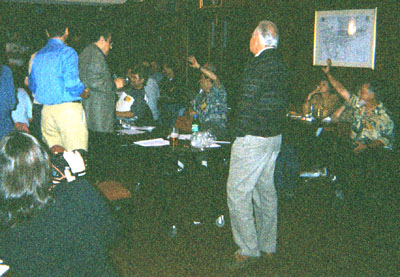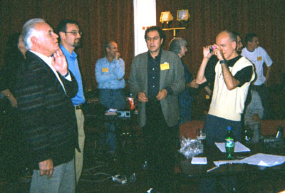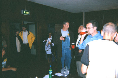 | Dave Ball and Gary Brooker drinking together; nearer the camera, Stefano and Antonio, from Italy | ||