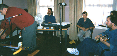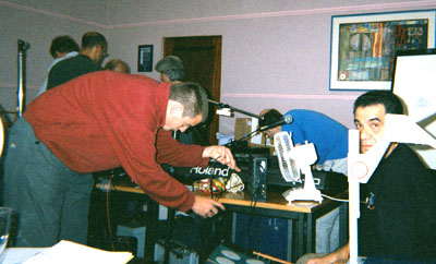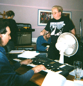 opportunity to run through a tune or two. The tireless Dave Godfrey sorts out some cables; Tito rubs shoulders with an overhead projector. |