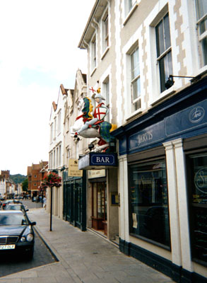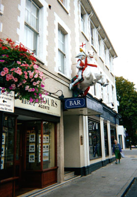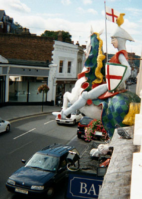 it's the flag of St George, patron saint of England. He famously trounced the dragon, yet he seems to strike little terror into the heart of that pigeon. And why he appears to sport a plastic duck on his head is something iconographers have yet to reckon with. A taxi-driver said this hotel was called "White Horse" because of this statue: it was a name more familiar to him than "Jarvis"! |