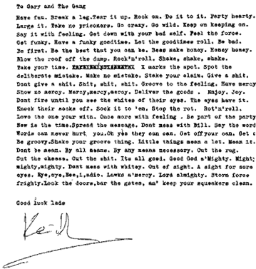 the text itself 'Feel free to share it with the fans if you think they will be interested' said Keith. Thanks to Franky Brooker for getting permission for BtP to exhibit this remarkable message. The text is © Bluebeard Music 2000 |