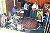 The whole band at work: click image to view glitter-ball, union flag, spare drums, church pew |