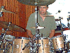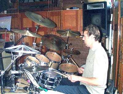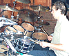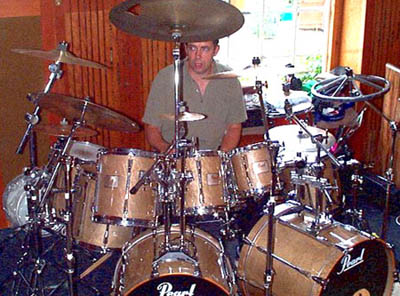 Mark at his big Pearl kit. Click image to count the kick drums ... can you see a spare snare too? |