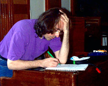 Gary at his 'knitting machine' ... click image to figure out what's on the corner nearest the camera |