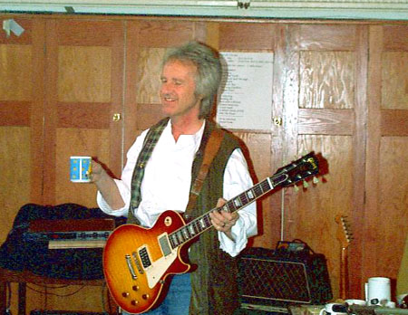 Mick with Les Paul and tea-cup: click hard enough and maybe you can read the set-list on the wall :-) |
