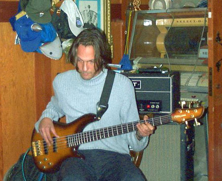 Matt with his bass: click image to count the strings, view the juke-box, marvel at the hats on the wall |