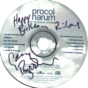 Next Gary comes out of the band's dressing room, flashing a curious grin -- his twinkling eyes and arched eyebrows betraying a hint of mischief -- and he promptly presents us with Gazza trinkets. Following a few snapshots, Franky rushes off to recover my shipwrecked CD. Astonishingly, she returns with it and my Sharpie pen, which Gary uses to inscribe the words "Happy birthday Richard!!! -- Gary Brooker." I am completely disarmed when he casually inquires, "Do you have time for a drink at the bar?". My reply is an ultimate no-brainer.