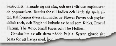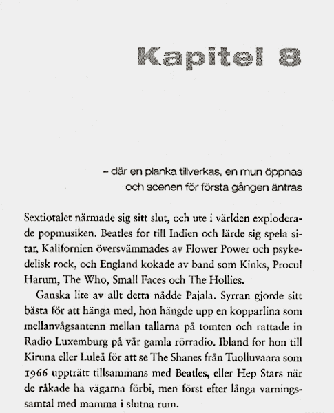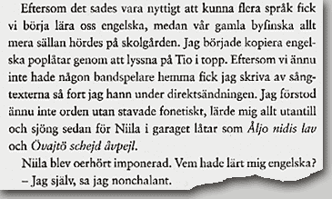"Since it was said to be useful to know several languages we were taught English. At the same time, our old Finnish was heard more seldom in the school yard. I started to copy English pop songs by listening to the Swedish Charts, "Tio i topp". Since we didn't yet have a tape recorder at home, I had to write down the lyrics as fast as I could during the show. I didn't understand the words yet, but spelled phonetically, learned everything by heart, and in the garage I sang to Niila tunes like Åljo nidis lav and Övajto schejd åvpejl. |