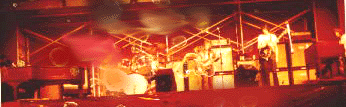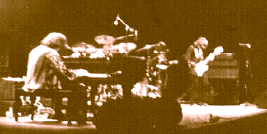 | Sadly, this photo suffered an accident somewhere along the line. Nonetheless, it gives an idea of how large the newly-reformed five-piece group was with piano grande and Hammond B3 at either side. I always preferred the 'look' of this layout to the drums-at-the-side arrangement of later years. Note that Alan Cartwright on bass is to BJ's left, whereas Dave Knights always stood to BJ's right. BJ was known to say that it was difficult to hear Gary, even with monitors, unless he was closer to him in the line-up. |