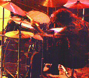 BJ in 1970 from an import album. Still using the grey Ludwig 'Ringo' set, BJ was just beginning to develop that 'octopus in the bathtub' style by now. Mick Grabham noted, 'any other drummer, you would have told to shut up' if they attempted to play as involved a part as BJ, complementing the music. His work on Fires (Which Burnt Brightly) is one of the best-constructed, intelligent approaches to drumming that I have ever heard. The way he leads us out of the organ solo is nothing short of inspired. |