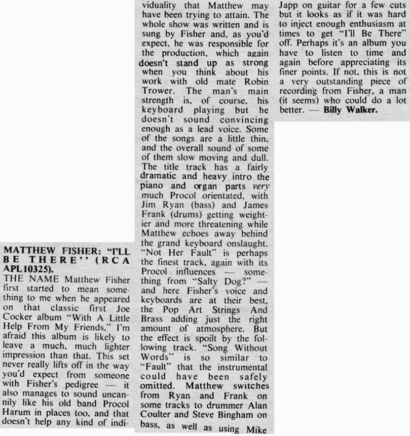 | MATTHEW FISHER: I’LL BE THERE (RCA APL 10325). THE NAME Matthew Fisher first started to mean something to me when he appeared on that classic first Joe Cocker album With A Little Help From My Friends. I’m afraid this album is likely to leave a much, much lighter impression than that. This set never really lifts off in the way you’d expect from someone with Fisher’s pedigree – it also manages to sound uncannily like his old band Procol Harum in places too, and that doesn’t help any kind of individuality that Matthew may have been trying to attain. The whole show was written and is sung by Fisher and, as you’d expect, he was responsible for the production, which again doesn’t stand up as strong when you think about his work with old mate Robin Trower. The man’s main strength is, of course, his keyboard playing but he doesn’t sound convincing enough as a lead voice. Some of the songs are a little thin, and the overall sound of some of them slow moving and dull. The title track has a fairly dramatic and heavy intro the piano and organ parts very much Procol orientated, with Jim Ryan (bass) and James Frank (drums) getting weightier and more threatening while Matthew echoes away behind the grand keyboard onslaught. Not Her Fault is perhaps the finest track, again its Procol influences – something from Salty Dog? – and here Fisher’s voice and keyboards are at their best, the Pop Art Strings And Brass adding just the right amount of atmosphere. But the effect is spoilt by the following track. Song Without Words is so similar to Fault that the instrumental could have been safely omitted. Matthew switches from Ryan and Frank on some tracks to drummer Alan Coulter and Steve Bingham on bass, as well as using Mike Japp on guitar for a few cuts but it looks as if it was hard to inject enough enthusiasm at times to get I’ll Be There off. Perhaps it’s an album you have to listen to time and time again before appreciating its finer points. If not, this is not a very outstanding piece of recording from Fisher, a man (it seems) who could do a lot better. – Billy Walker.