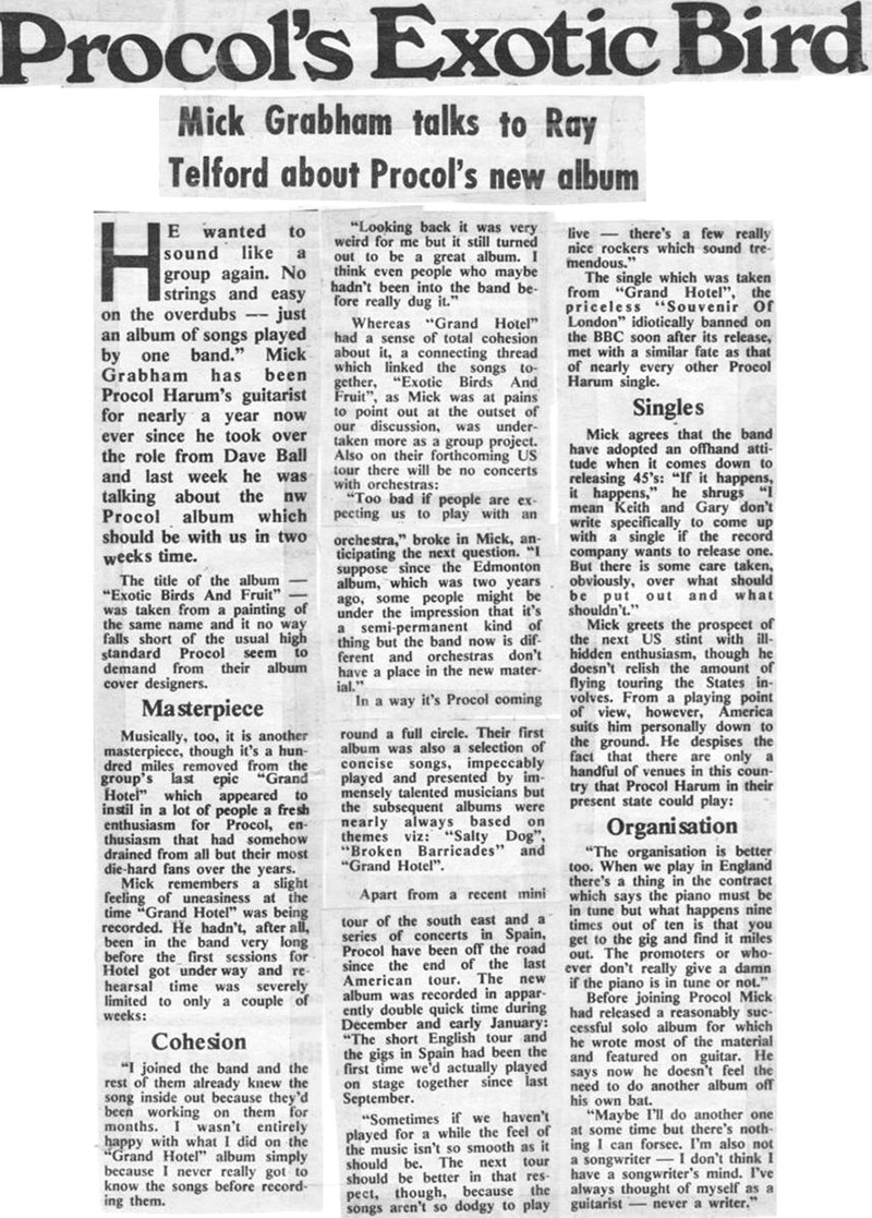 He wanted to sound like a group again. 'No strings and easy on the overdubs – just an album of songs played by one band.' Mick Grabham has been Procol Harum's guitarist for nearly a year, now ever since he took over the role from Dave Ball, and last week he was talking about the new Procol album which should be with us in two weeks' time.