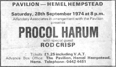 Choosing their gigs carefully and avoiding a large London venue, Procol Harum are playing such provincial fun palaces as the Hemel Hempstead Pavilion and attracting capacity audiences. Last Saturday at Hemel a thousand people crammed into listen rapt and spellbound to every note this by-now legendary band played.