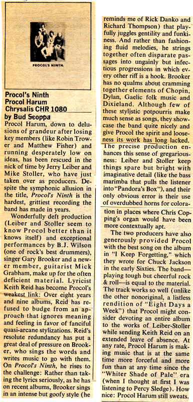 | Bud Scoppa in Rolling Stone, 9 October 1975 Procol Harum, down to delusions of grandeur after losing key members (like Robin Trower and Matthew Fisher) and running desperately low on ideas has been rescued in the nick of time by Jerry Leiber and Mike Stoller, who have just taken over as producers. Despite the symphonic allusion in the title, Procol's Ninth is the hardest, grittiest recording the band has made in years. Wonderfully deft production (Leiber and Stoller seem to know Procol better than it knows itself) and exceptional performances by BJ Wilson (one of rock's best drummers), singer Gary Brooker and a newer member, guitarist Mick Grabham, make up for the often deficient material. Lyricist Keith Reid has become Procol's weakest link: Over eight years and nine albums, Reid has refused to budge from an approach that ignores meaning and feeling in favor of fanciful quasi-arcane stylizations. Reid's resolute redundancy has put a great deal of pressure on Brooker, who sings the words and writes music to go with them. On Procol's Ninth, he rises to the challenge: rather than taking the lyrics seriously, as he has on recent albums, Brooker sings in an intense but goofy style (he reminds me of Rick Danko and Richard Thompson) that playfully juggles gentility and funkiness. And rather than fashioning fluid melodies, he strings together often disparate passages into ungainly but infectious progressions in which every other riff is a hook. Brooker has no qualms about cramming together elements of Chopin, Dylan, Gaelic folk music and Dixieland. Although few of these stylistic potpourris make much sense as songs, they showcase the band quite nicely and give Procol the spirit and looseness its work has long lacked. The precise production enhances this sense of gregariousness: Leiber and Stoller keep things spare but bright with imaginative detail (like the bass marimba that pulls the listener into Pandora's Box), and their only obvious error is their use of overdubbed horns for coloration in places where Chris Copping's organ would have been more contextually apt. The two producers have also generously provided Procol with the best song on the album with I Keep Forgetting, which they wrote for Chuck Jackson in the early Sixties. The band – playing tough but cheerful rock & roll – is equal to the material. The track works so well (unlike the other nonoriginal, a listless rendition of Eight Days a Week) that Procol might consider devoting an entire album to the works of Leiber-Stoller while sending Keith Reid on an extended leave of absence. At any rate, Procol Harum is making music that is at the same time more forceful and more fun than at any time since the Whiter Shade of Pale era (when I thought at first I was listening to Percy Sledge). How nice: Procol Harum still sweats. |
