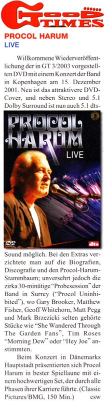 A welcome reissue of the DVD (reviewed in the March 2003 Good Times) with the band's concert from Copenhagen, 15 December 2005. The attractive DVD cover is new, and alongside Stereo and 5,1 Dolby surround it's now possible to listen in 5.1 dts sound. They've done away with the biographies, discography and the Procol family tree, but retained the rehearsal footage (about half-an-hour) of the band in Surrey where Gary Brooker, Matthew Fisher, Geoff Whitehorn, Matt Pegg and Mark Brzezicki play such rarely-heard numbers as She Wandered Through the Garden Fans [sic], Tim Rose's Morning Dew and Hey Joe. For this concert in the Danish capital Procol Harum presented themselves in top form with a high-class set that takes us through all phases of their career. (Classic pictures / BMG, 150 minutes) |