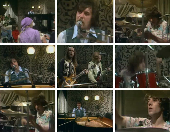 And what a bonus there will be – six songs from Procol's Danish TV special in 1974. This appears as an odd location – all the trappings of a 70s Indian restaurant with flock wallpaper and patrons seated at tables – but the band smokes ... at least that’s what one can anticipate from the short clips we have seen already. Gary hammers away and sings lustily, every inch a Braveheart character in his tartan waistcoat. The dynamic duo of Mick Grabham and Alan Cartwright look like a couple of likely lads who enjoy a pint with their music but (strangely) Chris Copping has so far not been seen – no doubt will be on the full version! But it is the appearance of BJ Wilson which gives you goosebumps – even a brief flash of Bringing Home the Bacon is long enough to savour his skill, two powerful hands moving with innate rhythm and creativity, using the cowbell to propel along the song in trademark fashion. I have assembled a few images here too – again apologies, no Chris Copping on view yet! [Chris was short-changed by the original camera-crew, sadly]