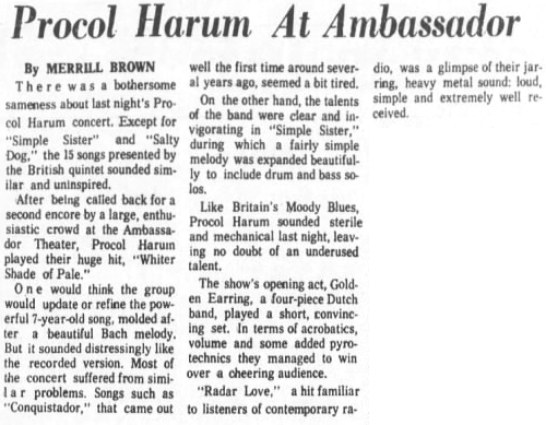 After being called back for a second encore by a large, enthusiastic crowd at the Ambassador Theater, Procol Harum played their huge hit, Whiter Shade of Pale.
