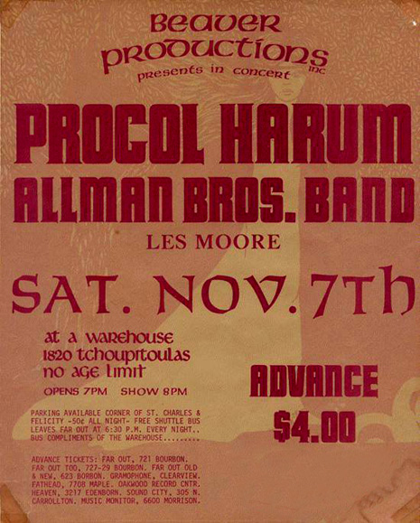 ![]() We guess this was 1970, when 7 November was indeed a Saturday. Tchouprtoulas is a street in New Orleans where the Warehouse venue opened in January of that year (thanks, Andrew Lawrence) |