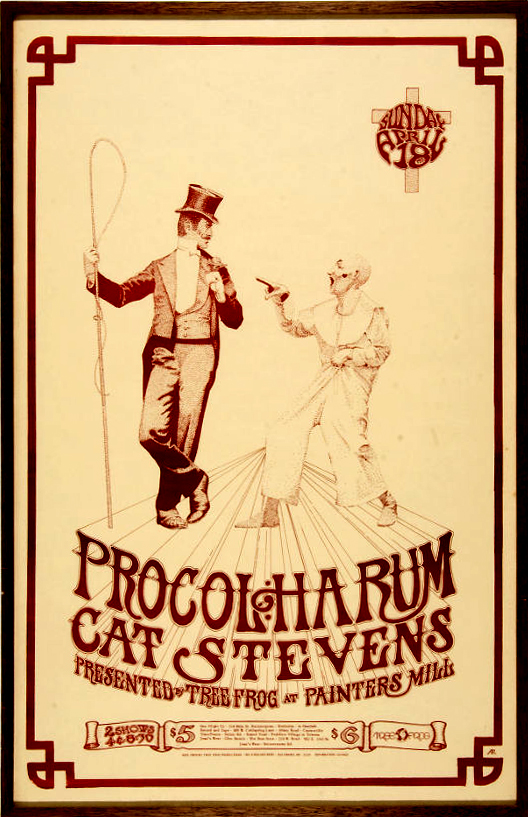 Procol were promoting Broken Barricades; Cat Stevens opened. 'Two shows (I was at both): a great night of music.' (Scott Pendleton) 'I saw them at a 1,500-seat theater in the round with Cat Stevens, 18 April 1971 concert presented by Tree Frog Productions held at Painters Mill, just outside Baltimore, MD (thanks, MLinVa)