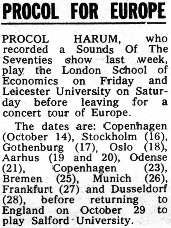 | 711023 | Copenhagen, Denmark | See 'Procol for Europe' clipping (thanks, Martin) ... it seems unlikely that Procol would play the Danish capital on both 15 and 23 October |
