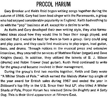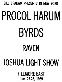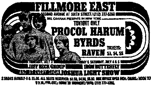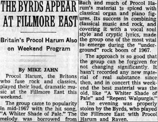 their loud, dramatic music at the Fillmore East this weekend. The group came to popularity in mid-1967 with the hit song A Whiter Shade of Pale. The melody was borrowed from Bach and much of Procol Harum's material is spiced with classical organ and piano figures. Its success in combining classical music and rock, and covering it with a vocal soul style and cryptic lyrics, made the group one of the most vital to emerge during the 'underground' boom of 1967. The approach is so good that the group can be forgiven for not changing significantly. It hasn't recorded any new material of real substance since then [sic!], and in concert this weekend the best material was the old, like A Whiter Shade of Pale and Repent Walpurgis. The evening was properly stolen by the Byrds, who played the Fillmore East with Procol Harum and Raven. | ![]() |