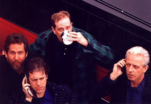 The Renovators: conducting business at right is Bob Mayo; talking into wallet is Bob Rasero; coffee mugging is Ted Hemberger; just plain mugging at left is Al Hemberger, subject of this page. |
