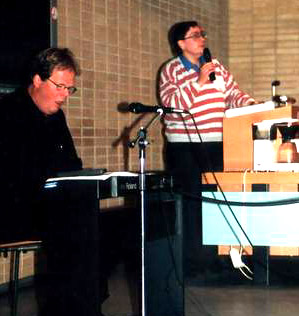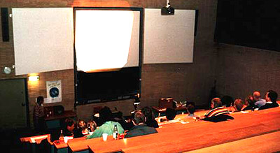 Thanks to Bøje Arenholt for the pictures, which show (a) the auditorium and the audience and (b) Niels-Erik explaining while Karsten Overgård - coughing into the keyboard - demonstrates chords in a song, probably by PH (Note the coffee machine).