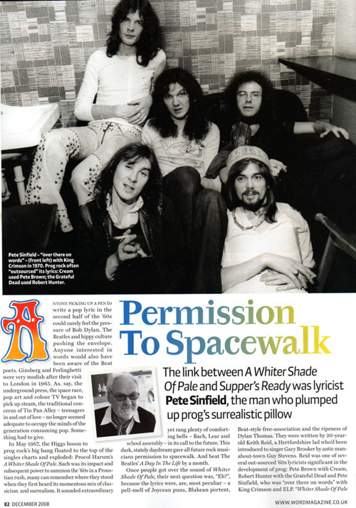 Once people got over the sound of Whiter Shade of Pale, their next question was, "Eh?", because the lyrics were, are, most peculiar – a pell-mell of Joycean puns, Blakean portent, beat-style free-association and the ripeness of Dylan Thomas. They were written by 20-year-old Keith Reid, a Hertfordshire [sic] lad who'd been introduced to singer Gary Brooker by antic man-about-town Guy Stevens. Reid was one of several out-sourced '60s lyricists significant in the development of prog: Pete Brown with Cream, Robert Hunter with the Grateful Dead and Pete Sinfield, who was "over there on words" with King Crimson and ELP. "Whiter Shade of Pale was very important from a lyrical point of view," Sinfield agrees. "And it made people aware of lyricists who were not in the band but of it."