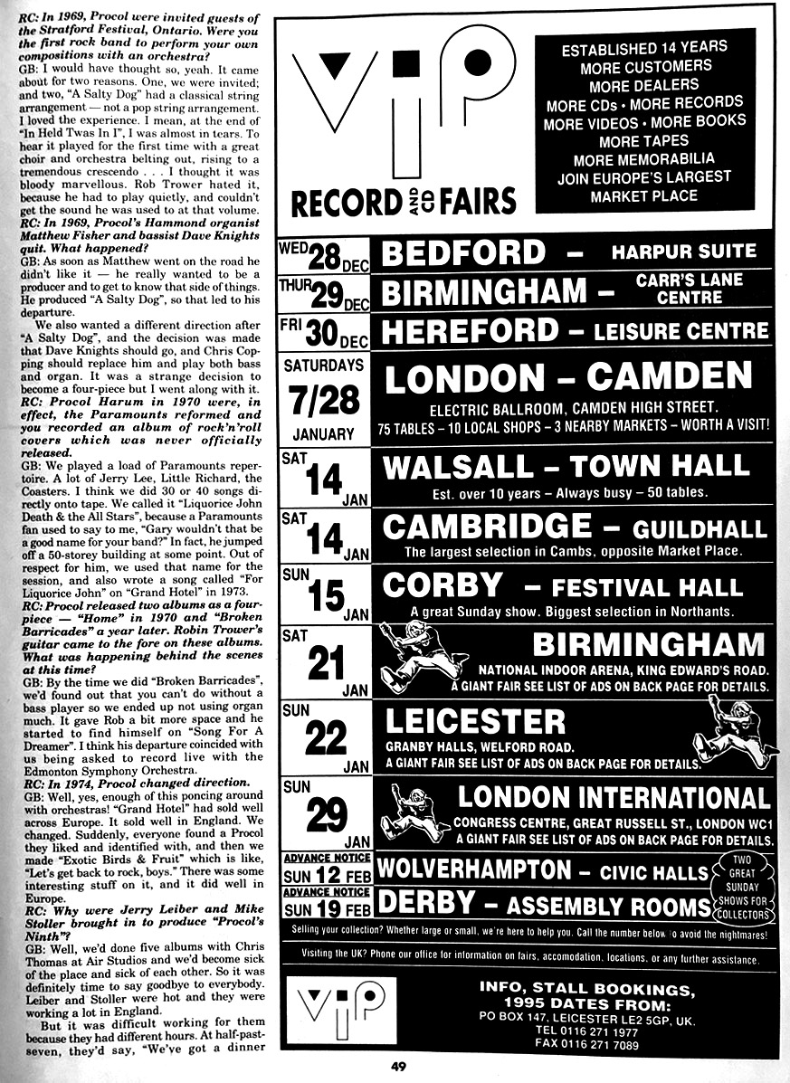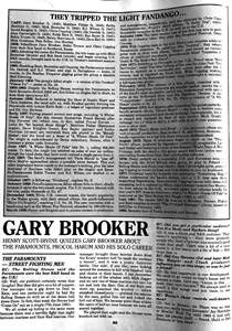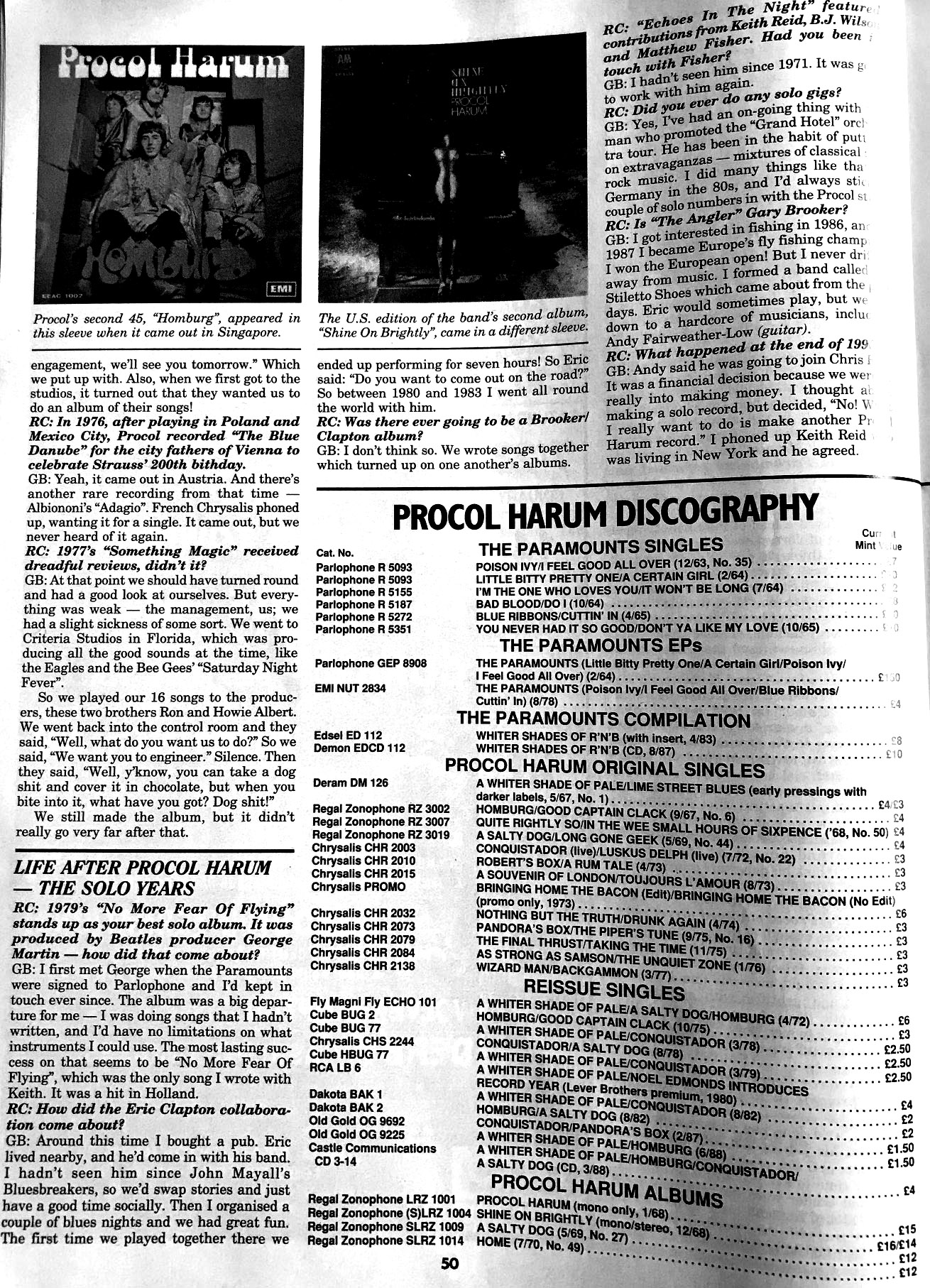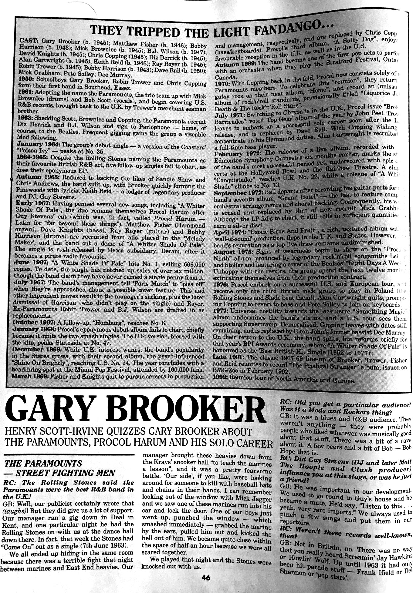 Wherever Procol go, though, 'A Whiter Shade Of Pale' follows. Gary Brooker performed a stirring, emotional version at last year's Mick Ronson tribute concert, and the song will inevitably reappear on BMG's forthcoming symphonic CD, alongside other classics like 'Conquistador' and 'Homburg'. Brooker, Trower and Fisher have all contributed to the recordings, together with Andy Fairweather-Low, Geoff Whitehorn, and Dave Bronze, plus arrangers Darryl Way and Nick Dodd, and not forgetting full orchestral backing.