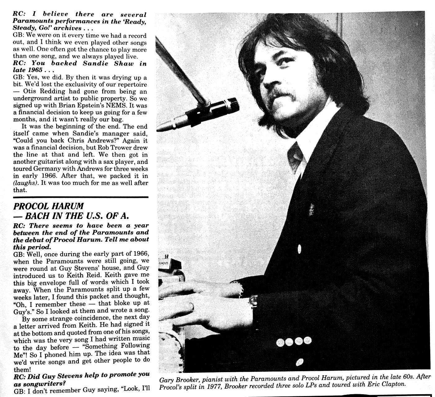 GB: Well, once during the early part of 1966, when the Paramounts were still going, we were round at Guy Stevens' house, and Guy introduced us to Keith Reid. Keith gave me this big envelope full of words which I took away. When the Paramounts split up a few weeks later, I found this packet and thought, 'Oh, I remember these – that bloke up at Guy's.' So I looked at them and wrote a song.