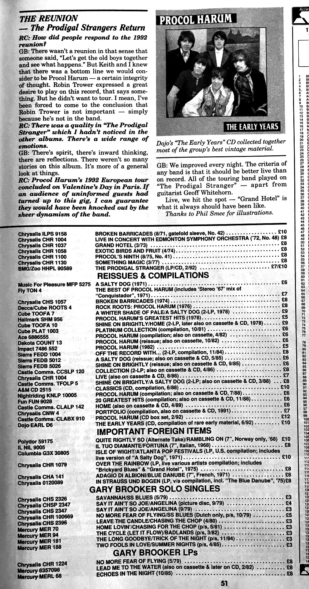 After almost a decade-and-a-half on ice, the band decided to regroup late in 1991 and record an eleventh album. Boasting the vintage late-60s line-up of Gary Brooker, Robin Trower, Matthew Fisher and Keith Reid, the record, 'The Prodigal Stranger', was supported by a series of U.S. tours in 1991, '92 and '93, and a European jaunt that ventured into all continental corners bar Britain. Only regulars of the Zero Six Club in the band's home town of Southend-on-Sea were lucky enough to witness this historic reformation (albeit without Trower, who declined to tour).
