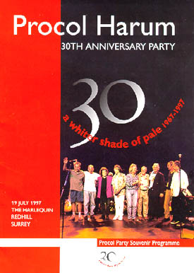 Here, nonetheless, are some impressions. It's a twenty-eight-page booklet on good A4 paper with still-heavier card cover, making thirty-two pages in all. The central eight pages contain black and white pictures, while the rest are in full colour. Graphic design, by Christine Ayre, is to the same exemplary standard that distinguished all the Redhill merchandise (Procol video box, Shine On archive, and so on); 'the glossy', as it has become known, has been carefully co-ordinated in terms of colour and typefaces, and clearly belongs to the same 'family': saddle-stitched with two wires, it will doubtless outlast the perfect-bound Shine On compendium.