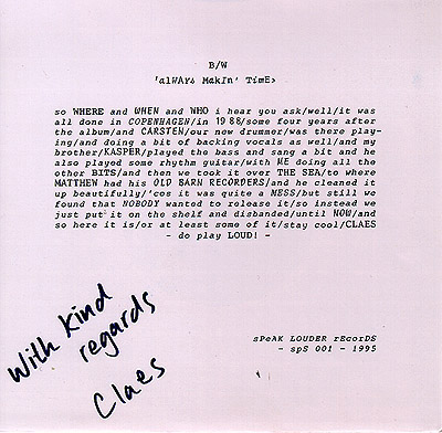 As Claes Johansen wrote in the liner note to the Angel Air Route 66 CD, 'In the summer of 1987 we went into a studio in Copenhagen to record five of my own songs for an intended mini album. They were done over two weekends for some money we had actually earned playing gigs! I suppose our style had changed a bit by then, and we were now leaning more towards groups like REM. This time around, however, the response was even poorer than back in '84; we couldn't get a deal at all. I took the master tapes to England and had Matthew re-mix them, but apart from two tracks which came out on a 7" single in 1995, this session remains unreleased until now.' |
