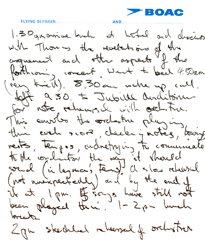 argument and other aspects of the forthcoming concert Went to bed 4.30 am (very tired) [17 November 1971] 8.30 am wake-up call Left 9.30 to Jubilee Auditorium for note rehearsal with orchestra. This involves the orchestra playing thru' each score, checking notes, bowings, rests, tempos, and trying to communicate to the conductor the way it should sound (in layman's terms). A slow rehearsal, not unexpectedly) and