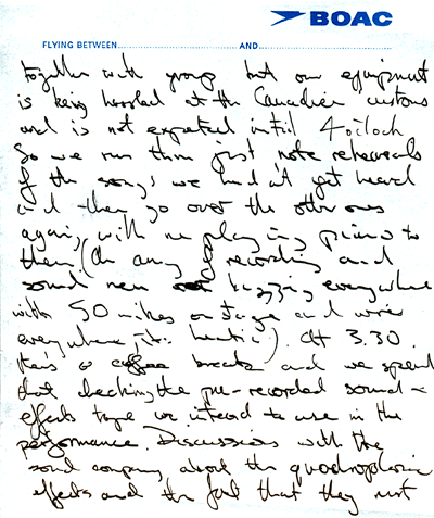 and is not expected until 4 o'clock So we run thru' just note rehearsals of the songs we hadn't yet heard and then go over the other ones again, with me playing piano to them (An army of recording and sound men buzzing everywhere with 50 mikes onstage and wires everywhere, it's hectic) At 3.30 there's a coffee-break and we spend that checking the pre-recorded tape we intend to use in the performance. Discussions with the sound company about the quadraphonic effects and the fact that they must |