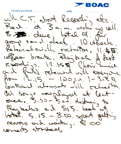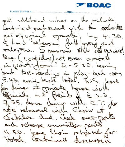 with the orchestra, our equipment operating by 4.30 Half hour rehearsing full group and orchestra. 5 numbers still not rehearsed. One (Conquistador [?]) not even arrived in 'part-form'. 5 – 5.30 hearing back test recordings in play-back room. 5.45 arrive back hotel 6.15 leave for dinner at private house with officials and friends of ESO. 7.55 leave dinner with CT for note rehearsal with Choir at Jubilee Aud. Check over parts and rehearse unwritten parts 11.30 leave choir rehearsal for Hotel. Continued discussion |