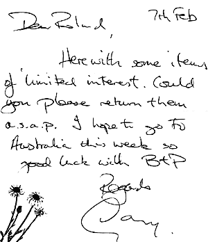 But in February 2000 Gary rang 'Beyond the Pale' with the suggestion that we might like to make use of 'some items of limited interest' that had recently come to light. Preparing to go to Australia with the British Rock Symphony, he had been rummaging for some music he needed, and had come across a diary, handwritten in black felt-tip on airmail tissue headed with the logo of the British Overseas Airways Corporation, that he thought 'must have been intended as notes for the album sleeve.' Unsurprisingly we told Gary, 'Yes, we would be rather interested in publishing this at BtP.' So here is that scoop!