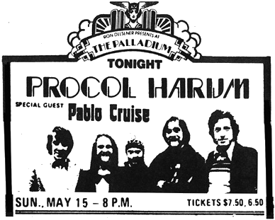 Marvin Chassman definitely recalls Bringing Home the Bacon being played as the second song; our informant, Beverly Peyton, concedes that 'it's possible I neglected to enter it on my list. There's also a possibility that I simply had Something Magic atop the list as a header for which tour it was and that SM was played after This Old Dog and Before Nothing But the Truth.' Bacon was in the band's repertoire on this tour, but most of the 1977 gigs we have set-lists for do start with Something Magic. Bert Saraco adds: 'To add a little bit of clarity to the sometimes-disputed details of (what I believe to be) the last Procol Harum show of the Old Testament performed on American soil: yes – the venue went by more than one name. The Academy of Music was also known as The Paladium. Two nights ago The Lovely Carina reached into her mysterious bag and produced a very nice more-than-two-thirds intact ticket for the show. Please notice that the orchestra seats cost only $7.50 each!' |