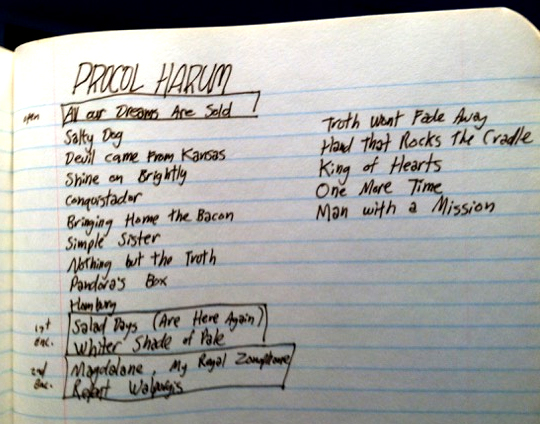 Set (not in exact order) Salty Dog The Devil Came from Kansas Shine on Brightly Conquistador Bringing Home the Bacon Simple Sister Nothing But the Truth Pandora’s Box Homburg The Truth Won’t Fade Away The Hand that Rocks the Cradle The King of Hearts One More Time Man With a Mission First encore: Salad Days Are Here Again (Brooker - Fisher duet) A Whiter Shade of Pale Second encore: Magdalene, My Regal Zonophone Repent Walpurgis | Our valued correspondent Jim Speer notes that these are the right songs but not necessarily in the right order. A scan of his notebook from the night appears further down the page. If you glance at the setlist from the night before, it's clear that the same songs were played (except Salad Days) both nights, so it would be a fair guess that the set on this page followed the order on this page. Note also that the set for two days before is identical to its successor In addition – as attested here – an audience part-recording of this concert exists in which the extant songs ... ...The King of Hearts ... are in the same order as at the preceding gigs (here and here) [Salad Days excepted, of course] Draw your own conclusions! |