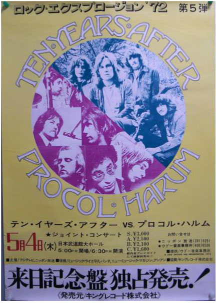 | Shine on Brightly Simple Sister Whaling Stories Fires (Which Burnt Brightly) Conquistador Homburg Bringing Home the Bacon Power Failure A Salty Dog In the Autumn of my Madness Look to Your Soul Grand Finale A Whiter Shade of Pale (2 verses) This was a joint concert with Ten Years After: other tunes may have been played, but this is what survives in recorded form. The setlist is of course very interesting, including two tunes from the forthcoming Grand Hotel album, with Dave Ball on guitar! (Thanks, Per) The poster (right) was kindly sent to 'Beyond the Pale' by Tanimura Koji in Japan |