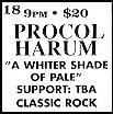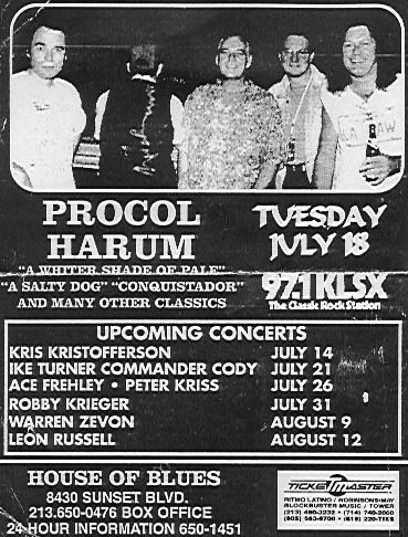 It cost $20 to see Procol Harum; the previous week the Kinks had played three nights at $37.50 a ticket. Robbie Krieger was $12.50 in the same month, Nitzer Ebb $20, Toots & the Maytals $17.50, Jefferson Starship $22.50, and the Ike Turner Revue + Commander Cody were $15. |