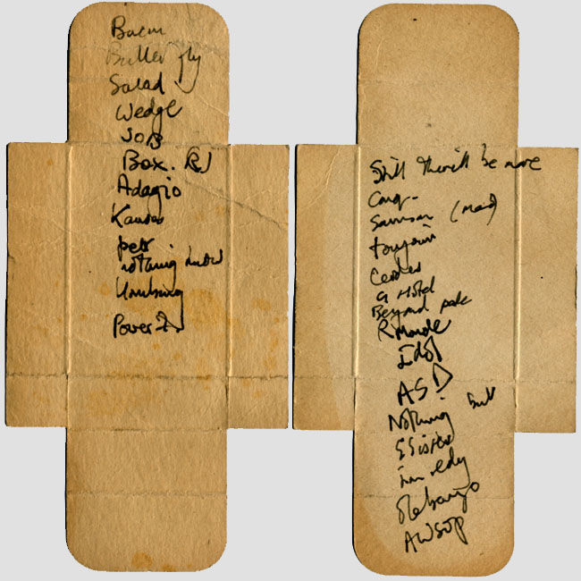 | Bringing Home the Bacon Butterfly Boys Salad Days (Are Here Again) The Thin End of the Wedge Shine on Brightly Robert's Box Adagio di Albinoni The Devil Came from Kansas The Poet [latterly 'Without a Doubt'] Nothing That I didn't Know Homburg Power Failure Still There'll be More Encores: |