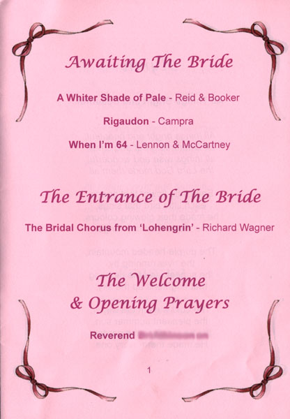 Pictured left is the opening of an unusually-lavish 16-page programme for a provincial wedding in the UK, which was solemnised in May 2008. We've been asked by our contributor not to provide any further detail (that's why the pastor's name in our scan is blurred out) in order to spare the blushes of the bride and groom, who have incorrectly attributed A Whiter Shade of Pale. No such indignity attends Campra, Lennon & McCartney, or Richard Wagner. Procol Harum seem unusually prey to such inaccuracies. Yet 'Reid & Booker', curiously, is a real songwriting partnership. A couple of tracks on Keith Reid's solo album, The Common Thread, have music written by the UK's Steve Booker, riding high in the 2008 charts with Duffy ('the Welsh Dusty Springfield' etc etc). As Keith quipped when he rang BtP about The Common Thread, there is 'only an R between us' – between the classic Brooker/Reid and the latterday Booker/Reid. Somehow the remark is reminiscent of 'so much C between us' – probably not intentionally so. Doubtless there are many people who've used the famous Procol Harum piece for their weddings: remind yourself of this page for example.