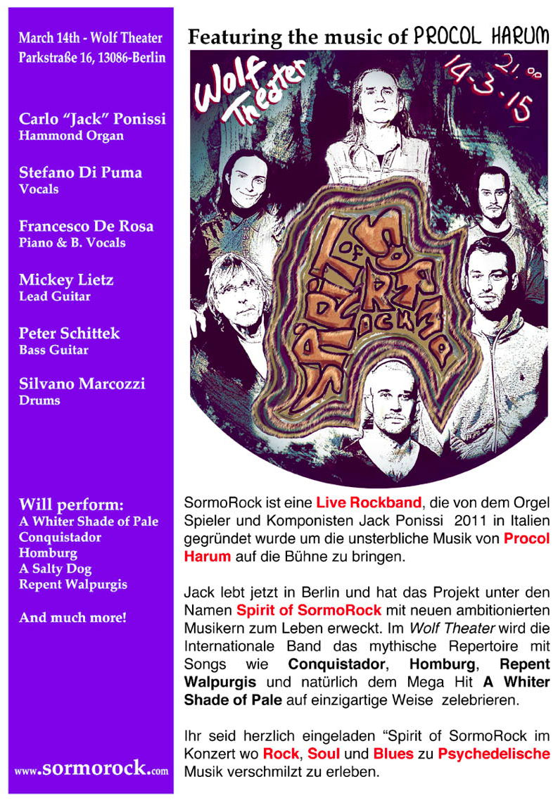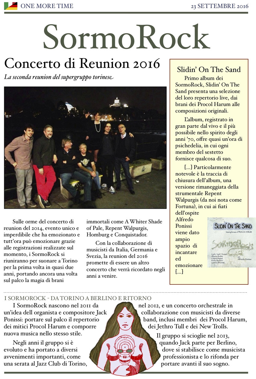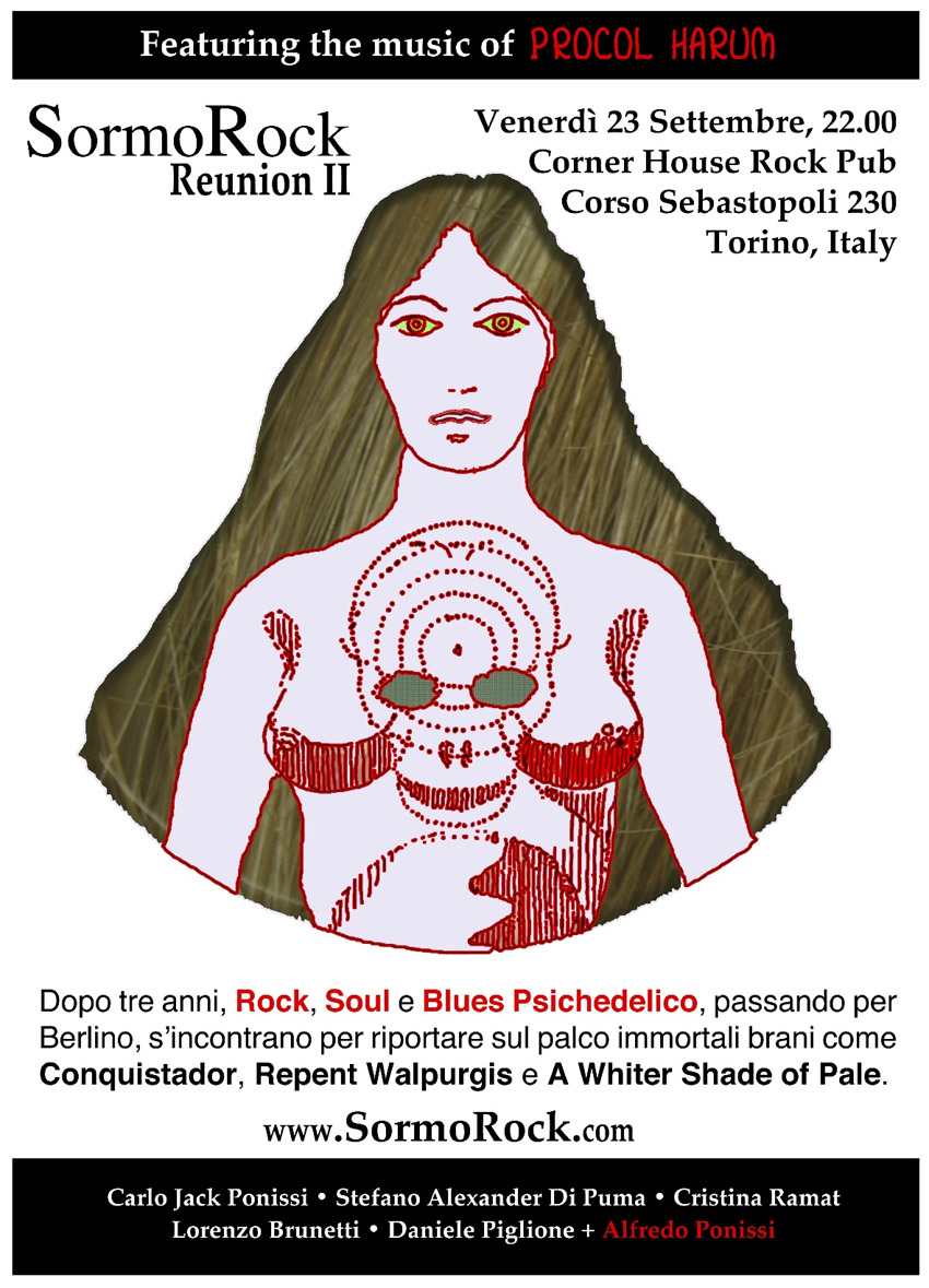 On Sunday 18 September 2011 my band, "SormoRock", whose repertoire is mainly made of Procol Harum music, will be on stage for its first real concert. We will take part in the new rock festival of my home city, "San Mauro in Rock 1.0", along with other local bands. The concert will start at around 18 (GMT+2), since each band will play for about one hour we will be on stage after 20.